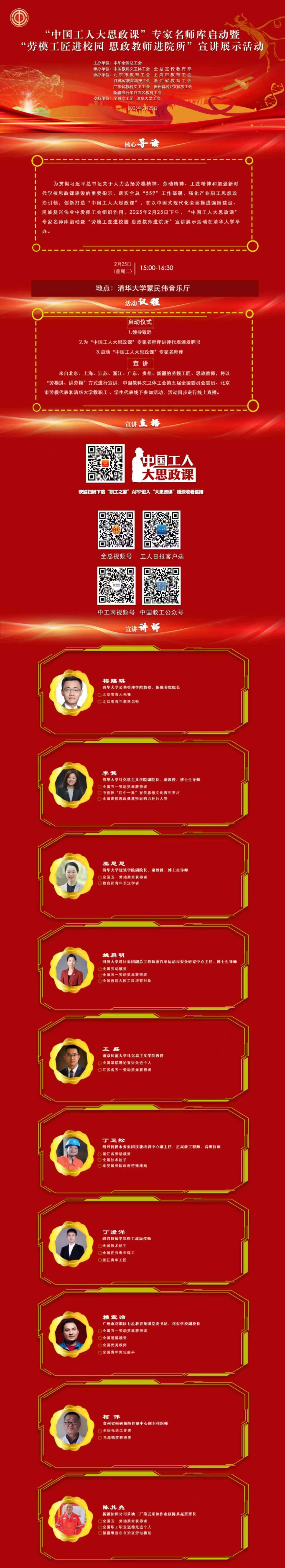 由全国总工会主办,中国教科文卫体工会、全总宣教部承办的“中国工人大思政课”专家名师库启动暨“劳模工匠进校园思政教师进院所”宣讲展示活动将于2025年2月25日下午15:00在清华大学举办。活动全程进行网上直播,请各分工会积极组织收看!